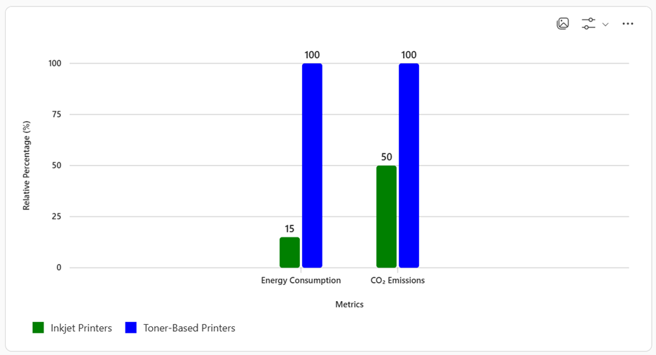 Corporate sustainability goals make printer choice critical. Refer to this the bar chart comparing Energy Consumption and CO₂ Emissions for Inkjet vs. Toner printers: